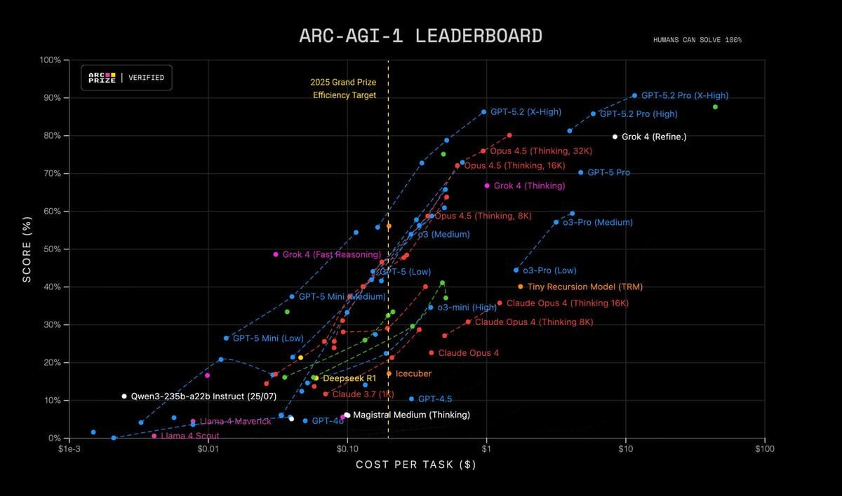We are reaching the end of 2025 with four big frontier models, Gemini 3 Pro, Claude Opus 4.5, Grok 4.1, and GPT-5.2, that are all genuinely strong. Scaling has not hit any hard wall. Test-time compute, where models spend more inference cycles "thinking" before responding, continues to extend capability in ways that would have seemed implausible eighteen months ago. Intelligence per dollar keeps improving along a steeper curve. These models, in aggregate, present remarkable capability across coding, research, creative work, mathematical reasoning, and business productivity.